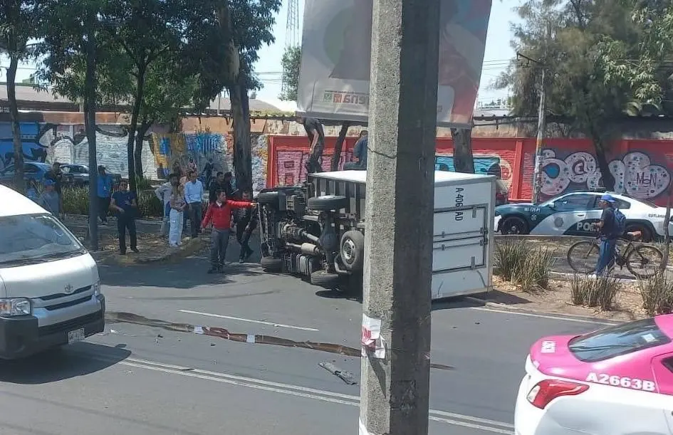 El conductor de una camioneta de carga, dio vuelta en un retorno equivocado, provocando que un automovilista lo golpeara y lo volcara en Azcapotzalco.
