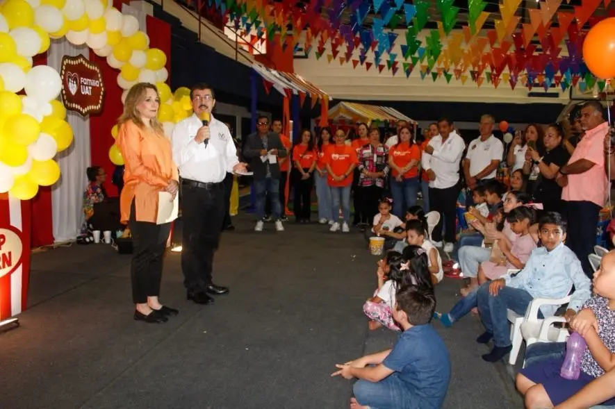 CIUDAD VICTORIA, Tamaulipas.- El rector de la Universidad Autónoma de Tamaulipas, MVZ Dámaso Leonardo Anaya Alvarado, y su esposa, Lic. Isolda Rendón de Anaya, pusieron en marcha los eventos del Día del Niño y de la Niña que la casa de estudios organiza para festejar a los hijos e hijas del personal universitario afiliado al Sindicato Único de Trabajadores de la UAT.