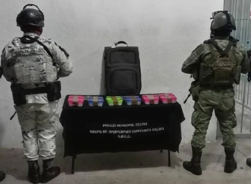 Elementos del Grupo Operaciones Especiales de Celaya (GOEC) de la Policía Municipal, el Ejército y la Guardia Nacional en encontraron la maleta de color negro durante un operativo de vigilancia.