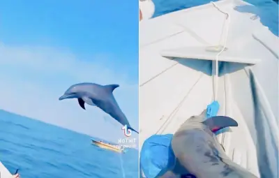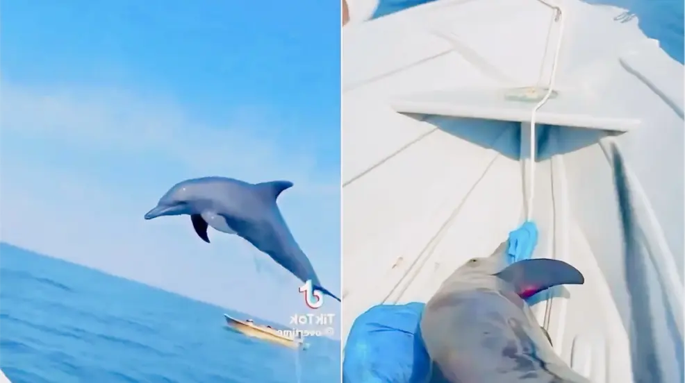 Un video viral muestra a un delfín cayendo accidentalmente en una lancha en BCS tras calcular mal la distancia durante un salto. Ofrecía un espectáculo a turistas.