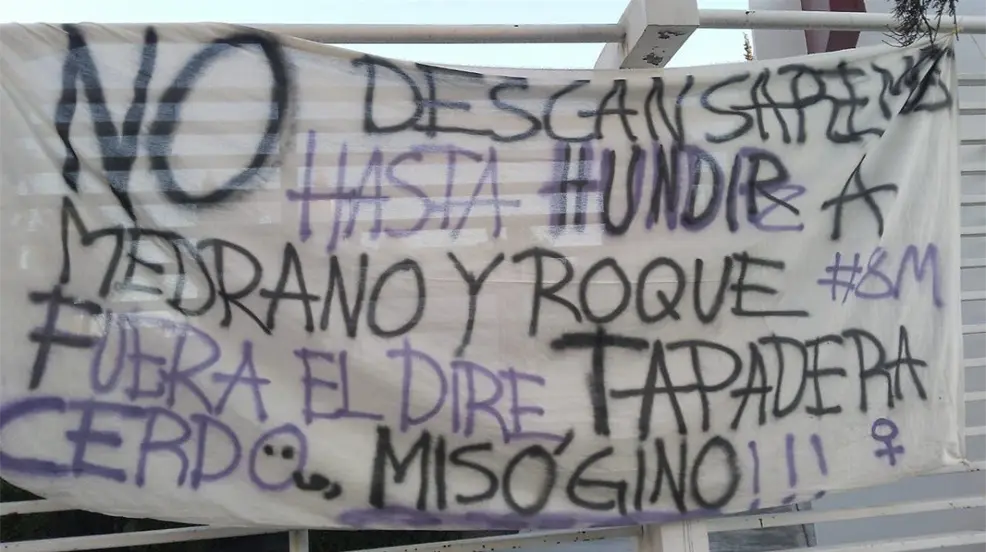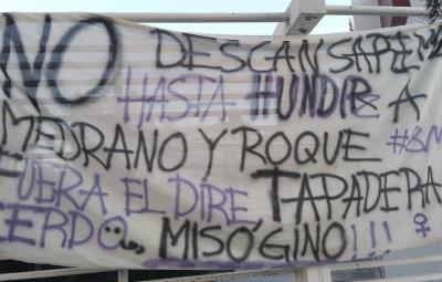 “No descansaremos hasta hundir a Medrano y Roque, fuera el dire, tapadera misógino #8M”, señala el mensaje instalado cerca del ingreso a la escuela.