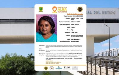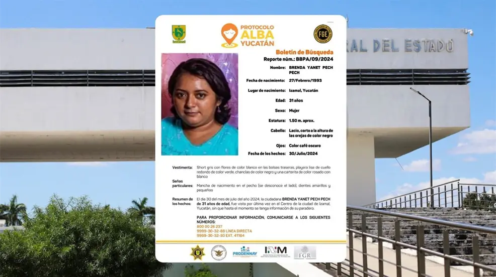 MÉRIDA, Yucatán.- La FGE Yucatán informa sobre la activación del Protocolo Alba por la desaparición de una mujer de 31 años, identificada como Brenda Yanet Pech Pech, por lo que se pide el apoyo para su búsqueda y localización.
