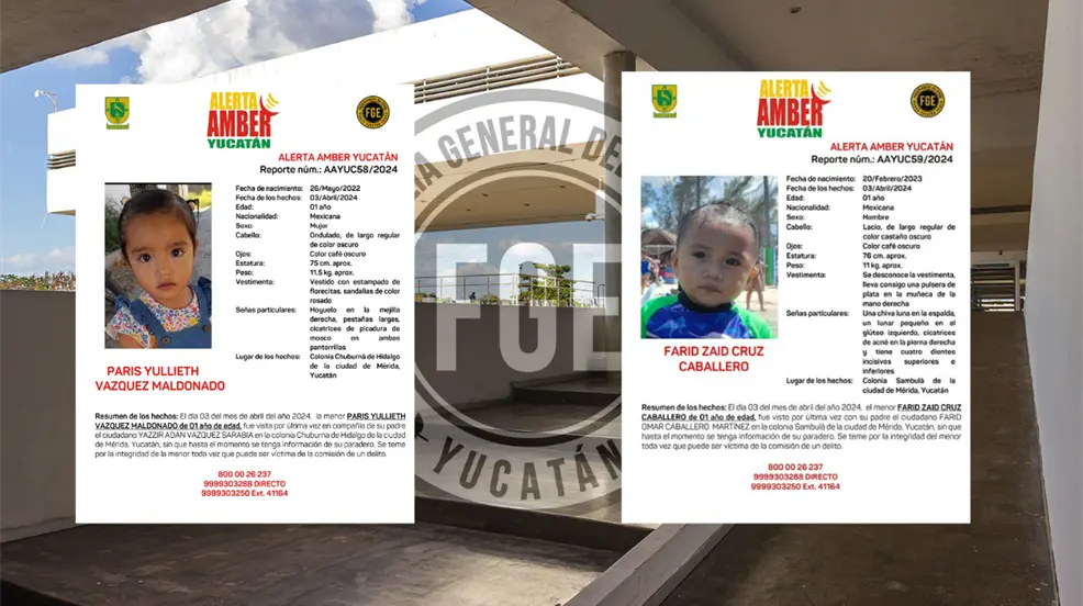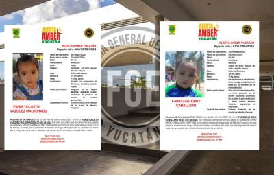 MÉRIDA, Yucatán.- En las últimas 24 horas, la Fiscalía General del Estado (FGE) Yucatán informó sobre la activación de dos Alerta Amber, por la desaparición de dos menores, un niño y una niña, de un año de edad, vistos por última vez en distintos puntos de Mérida.