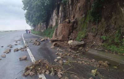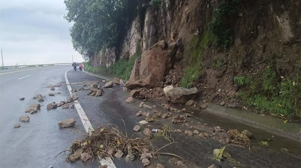 Piedras caen sobre la carretera tras intensas lluvias.