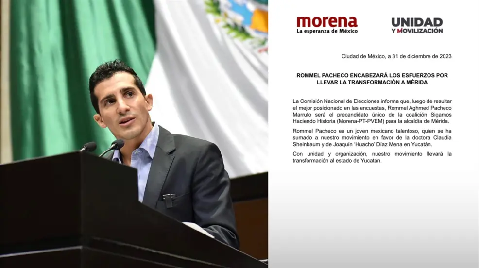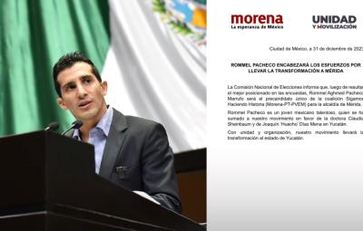 MÉRIDA, Yucatán.- La Comisión Nacional de Elecciones ha anunciado que Rommel Pacheco se erige como el precandidato principal de la coalición conformada por Morena, PT y Partido Verde para la alcaldía de Mérida, Yucatán. Este nombramiento sigue a su destacada posición en la reciente encuesta llevada a cabo como parte del proceso interno de la coalición.