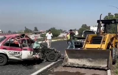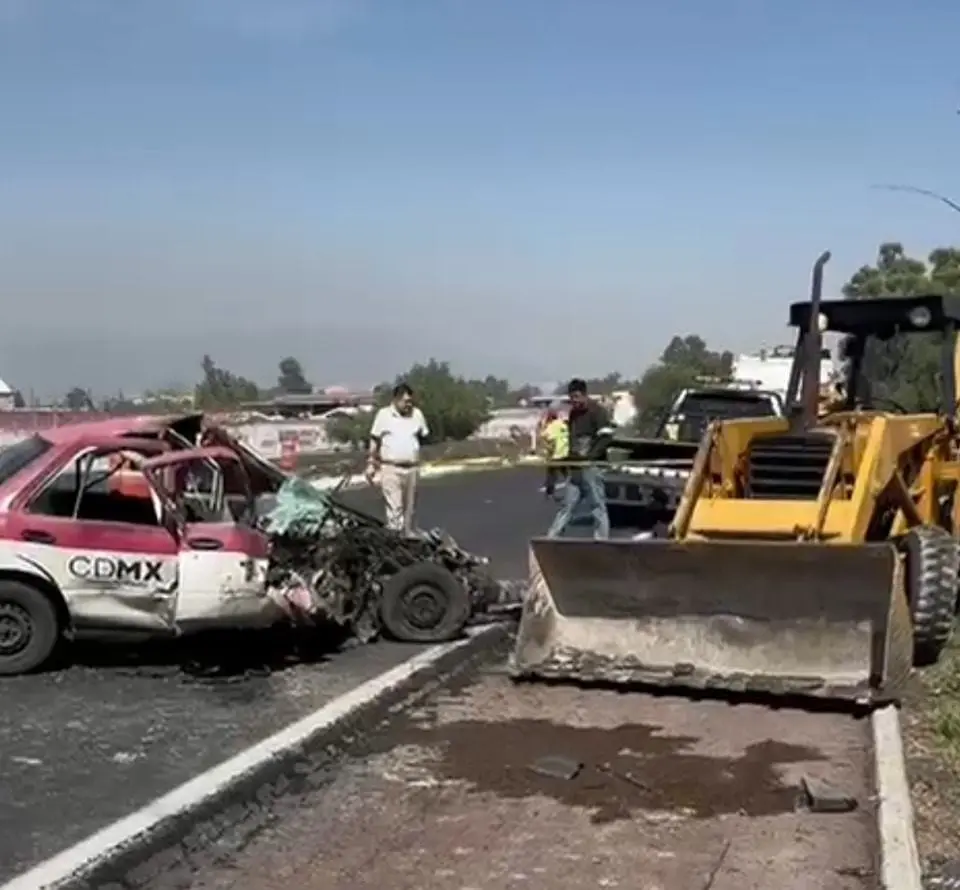 El choque de un taxi con una retroexcavadora ocurrió en el kilómetro 04 de la utopistas Ecatepec-Pirámides, en el lugar murió una mujer que viajaba como acompañante en el vehículo de alquiler.