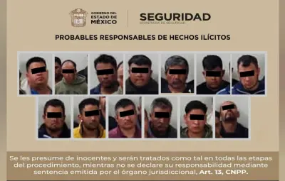 HUEHUETOCA, Estado de México.– En una acción conjunta de la Secretaría de Seguridad del Estado de México (SSEM), la Secretaría de la Defensa Nacional (SEDENA) y la Fiscalía General de Justicia del Estado de México (FGJEM), se logró la detención de 13 hombres, presuntos integrantes de una banda dedicada al robo de transporte. La operación también resultó en la confiscación de tres armas de fuego, supuesta droga, varios teléfonos celulares y seis vehículos.