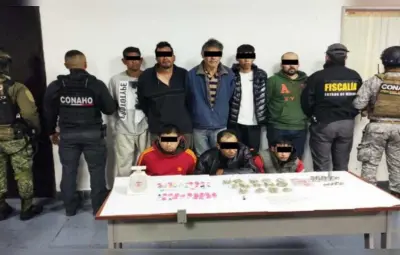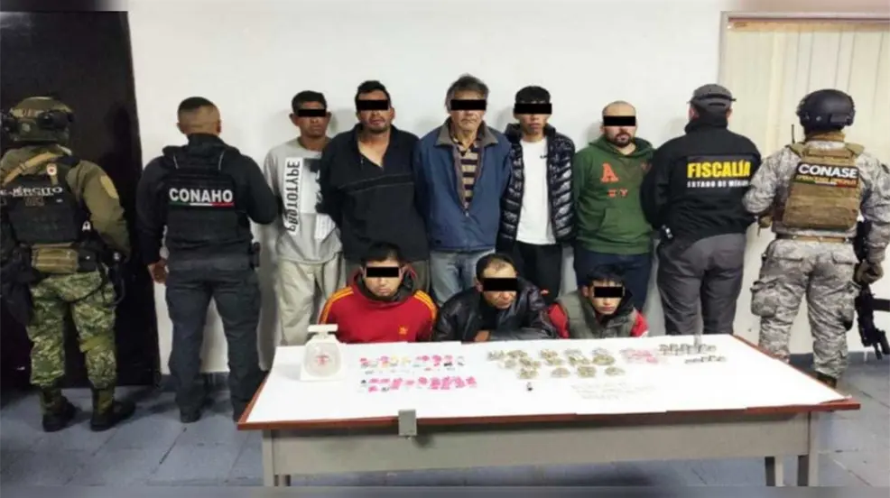 Por otro lado, fueron arrestados en flagrancia Brian Jobani “N”, Octavio “N”, Edwin Abraham “N”, Román Alberto “N”, Edgar “N”, Erick “N”, Noé “N” y Jorge Gabriel “N”, en Tlalnepantla, a quienes les decomisaron una motocicleta con el número de identificación alterado, así como diversas dosis de cocaína en piedra.
