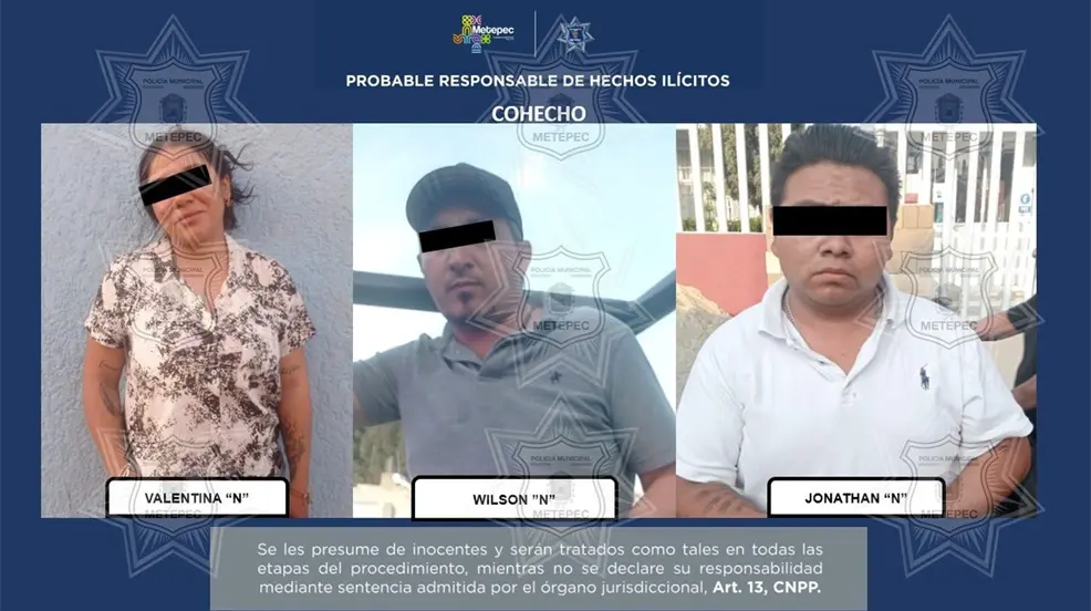 METEPEC, Estado de México.- En un operativo coordinado entre la policía de Metepec y elementos de la Secretaría de Seguridad Ciudadana, una pareja de origen colombiano y un hombre mexicano fueron detenidos por el delito de cohecho en el pueblo de San Miguel Totocuitlapilco.