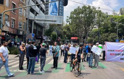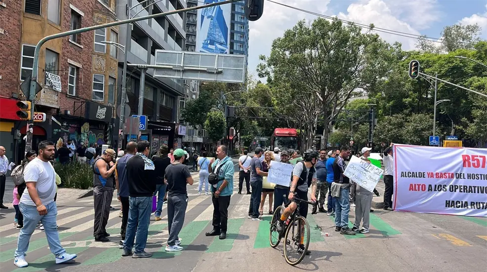 Transportistas disidentes de la Ruta 57 bloquean Insurgentes exigiéndole a la Semovi detener operativos en su contra, autoridades insisten en la modernización.