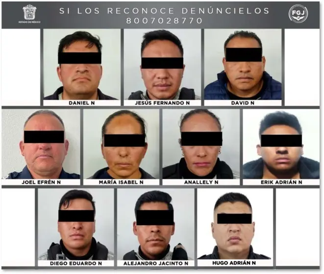 ESTADO DE MÉXICO.- La Fiscalía General de Justicia del Estado de México (FGJEM) detuvo a 21 personas, incluidos 10 policías municipales, en una operación que expuso y desarticuló una red delictiva relacionada con una organización criminal con orígenes en Jalisco.
