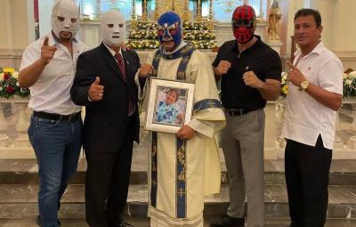 Después de celebrar las eucaristías y cumplir con sus misión evangélica, el Padre Gustavo Becerra, se quita su sotana y se pone su máscara y el traje de luchador, para subirse al ring y seguir promoviendo desde el mundo del pancracio entre la lona y las cuerdas la fe.