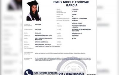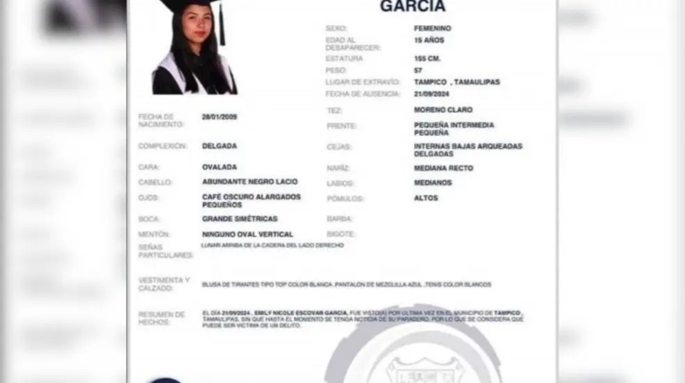 TAMPICO, Tamaulipas.- Una nueva adolescente desaparecida se suma a la lista en el sur del estado, esta vez en la ciudad de Tampico. Se trata de Emily Nicole Escovar García, de 15 años, quien fue vista por última vez el 21 de septiembre en el Centro Alarma de la ciudad. Hasta el momento, no se tiene información sobre su paradero. Emily vestía una blusa blanca tipo top, pantalón de mezclilla azul y tenis blancos al momento de su desaparición.