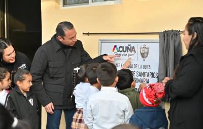 ACUÑA, Coahuila. - Con el fin de mejorar la infraestructura y destacar un compromiso continuo con la educación de la niñez, el alcalde Emilio de Hoyos Montemayor y la directora de Desarrollo Social, Tania Pérez Rivera, encabezaron la entrega de obra de rehabilitación de Módulos Sanitarios en la Primaria Vicente Guerrero.
