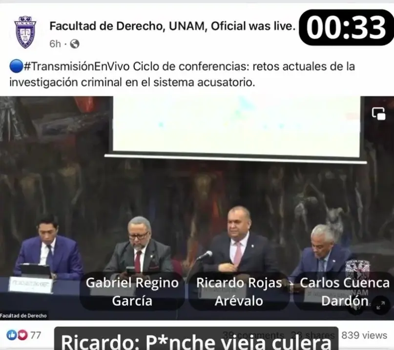 CIUDAD DE MÉXICO.- Durante el Ciclo de Conferencias 'Retos Actuales de la Investigación Criminal en el Sistema Acusatorio' de la Universidad Nacional Autónoma de México (UNAM), el secretario general de la Facultad de Derecho, Ricardo Rojas Arévalo, protagonizó un incidente lamentable al dirigir insultos verbales a la directora de la Escuela Nacional de Ciencias Forenses, Zoraida García Castillo. Durante el evento, Rojas Arévalo se refirió a la directora utilizando un lenguaje inapropiado y ofensivo, generando consternación entre los presentes.
