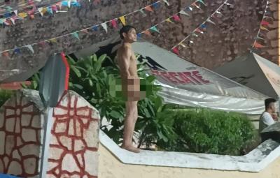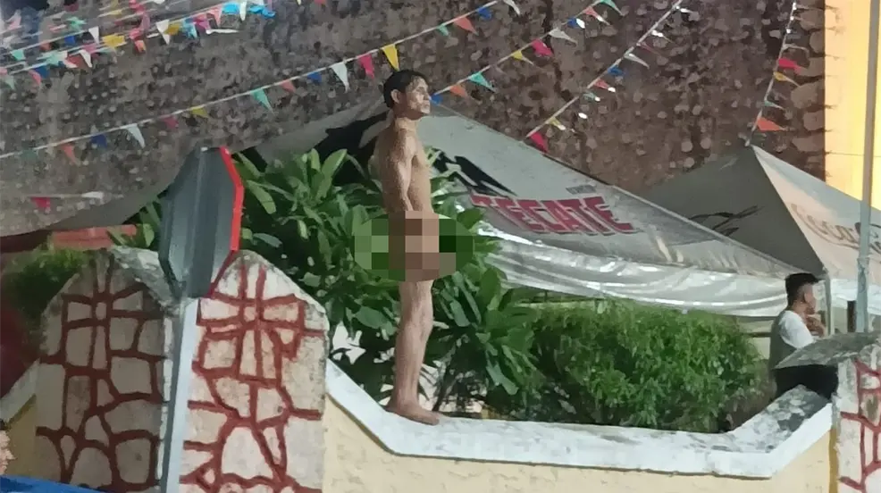TETIZ, Yucatán.- En plena Feria de Tetiz, un hombre atrajo las miradas de los asistentes, pues decidió, quitado de la pena, pasearse desnudo por el lugar, incluso se subió a uno de los muros del atrio de la iglesia para ver desde ahí la corrida de toros.