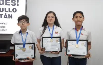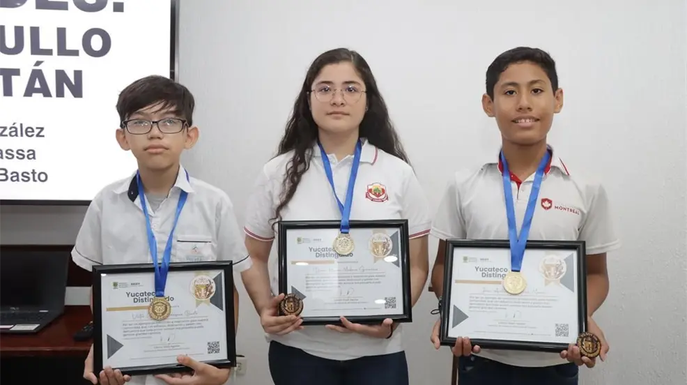 MÉRIDA, Yucatán.- Dana Karen Medina González, José Antonio Bernal Massa y Víctor Gerardo Vázquez Basto fueron reconocidos con la medalla “Yucatecos Distinguidos”, de manos del Rector de la UADY, Carlos Alberto Estrada Pinto, y del secretario de Educación, Liborio Vidal Aguilar, por obtener este pase al torneo internacional.