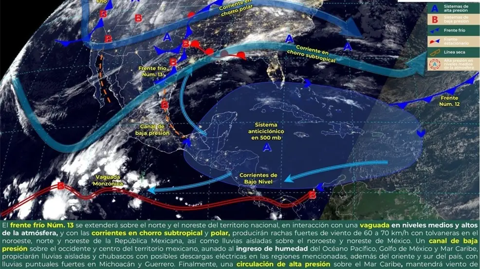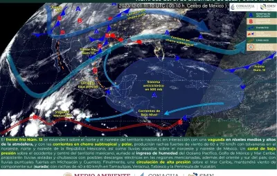 MÉRIDA, Yucatán.- Para este viernes, el clima en Yucatán estará influenciado por el Frente Frío número 12, que se extenderá de manera estacionaria sobre el occidente del Mar Caribe. Según el Sistema Meteorológico Nacional (SMN), canales de baja presión en el Occidente, Centro y Sureste del país, junto con el ingreso de humedad, generarán lluvias y chubascos vespertinos, acompañados de descargas eléctricas en la región yucateca.