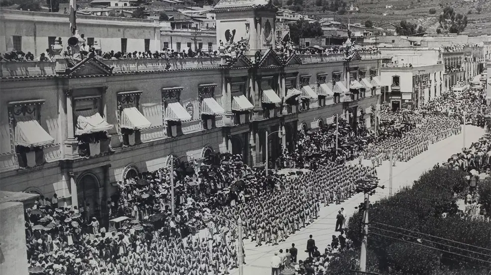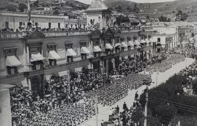 En ésta se muestra un desfile conmemorativo del 16 de septiembre, pasando frente al antiguo Palacio de Gobierno del Estado de México, donde ahora se encuentra la sede del Poder Judicial del estado, con la intención de reflejar las festividades vinculadas a la celebración de la Independencia, que fueron tomando lugar gradualmente a lo largo de los siglos XIX y XX.
