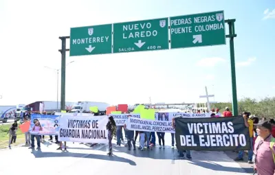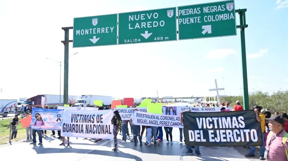 NUEVO LAREDO, Tamaulipas.- Desde las 11:30 de la mañana, familiares de víctimas de ejecuciones extrajudiciales presuntamente cometidas por elementos de la Secretaría de la Defensa Nacional (SEDENA) y la Guardia Nacional bloquearon los accesos al Puente Internacional 3 "Del Comercio Mundial". Exigen justicia y la intervención de la presidenta Claudia Sheinbaum en casos de violencia y abuso de autoridad.