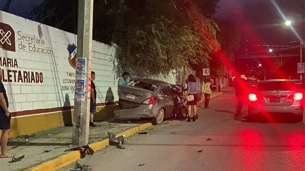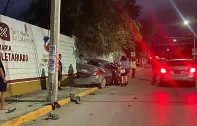 VICTORIA, Tamaulipas.- En la madrugada de este sábado se registró un grave percance vial en la colonia Mainero, donde un vehículo Nissan Versa con cinco personas a bordo perdió el control y se impactó contra un poste y la barda de una escuela primaria.