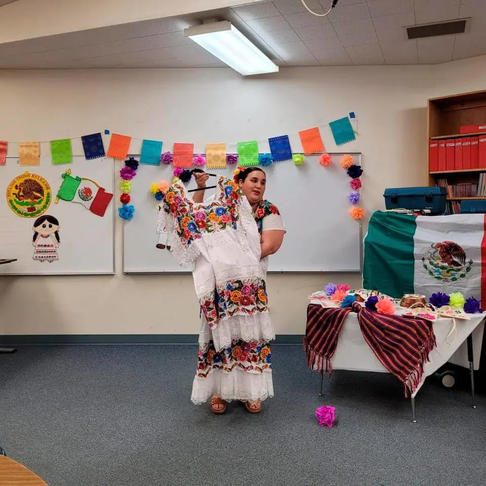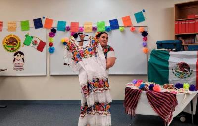 La maestra Alicia Romero visitó la Pioneer Elementary School para realizar actividades que muestran parte de la cultura del estado