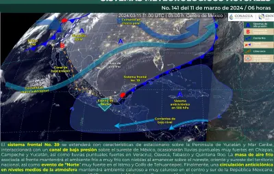 CIUDAD DE MÉXICO.- Este lunes 11 de marzo, el frente frío no. 39 extenderá sus características de estacionario sobre la Península de Yucatán y Mar Caribe. Su interacción con un canal de baja presión, ubicado en el sureste del país, ocasionará lluvias puntuales muy fuertes y fuertes en el sureste y entidades del Golfo de México.