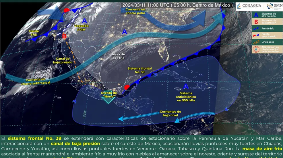 Este lunes 11 de marzo, el Frente frío no. 39 traerá lluvias muy fuertes en el sureste de México, así como en entidades del norte y centro del país