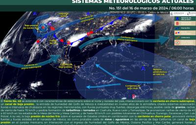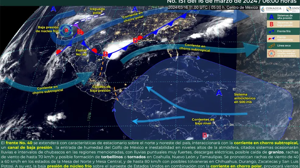 CIUDAD DE MÉXICO, México.- Este sábado 16 de marzo, el frente frío no. 40 se extenderá sobre el norte del país, por lo que se extenderá con característica de estacionario e interaccionará con la corriente en chorro subtropical, a la vez, un canal de baja presión, que propiciará la entrada de humedad del Golfo de México e inestabilidad en niveles altos de la atmósfera.