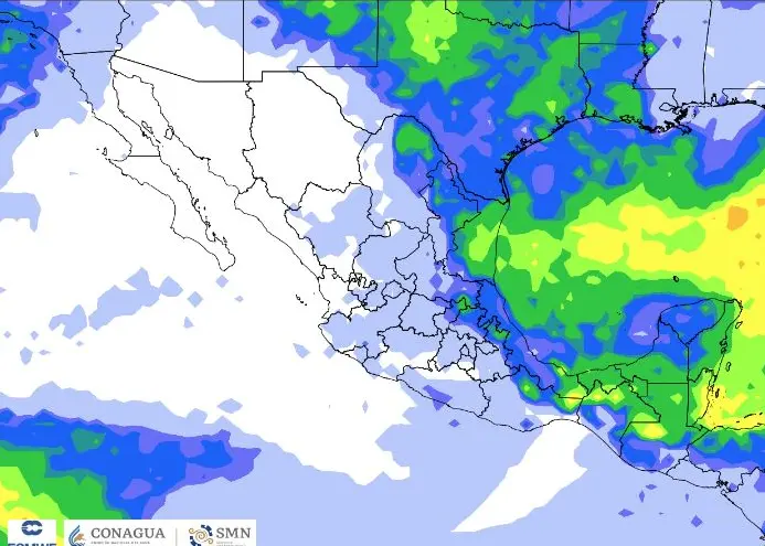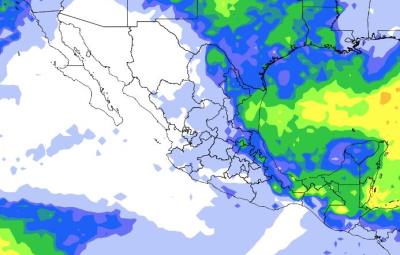 Durante el viernes, el sistema frontal se extenderá en el noreste de la República Mexicana y el Golfo de México en interacción con un canal de baja presión sobre dicho golfo, lo que ocasionará lluvias fuertes a muy fuertes en el noreste, oriente y sureste del país además de la Península de Yucatán.