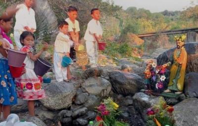 Después, con cubetas en las manos, los menores pidieron a la imagen, con oraciones en español y en náhuatl, enviar aguaceros para que el río vuelva a llenarse.