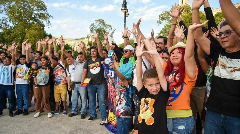 Fanáticos viajaron desde Cancún para participar en genkidama masivo en Plaza Grande