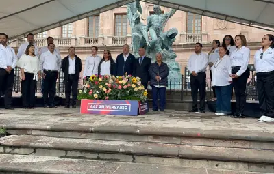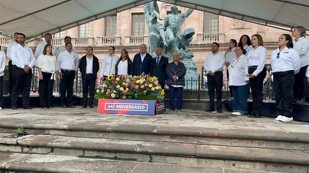 SALTILLO, Coahuila. - Para celebrar el aniversario 447 de Saltillo, autoridades encabezadas por el alcalde José María Fraustro Siller, montaron una guardia de honor y depositaron una ofrenda floral en la Plaza de la Nueva Tlaxcala, para rendir tributo a los fundadores de nuestra ciudad, así como a aquellos que habitaron la villa de Santiago del Saltillo fundada en 1577.