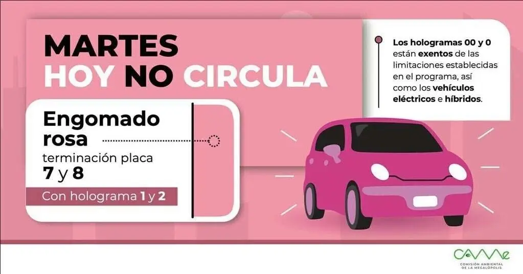 Este martes 8 de octubre el programa Hoy No Circula aplica para vehículos con engomado rosa, con terminación de placas 7 y 8, y que porten holograma de verificación 1 y 2. Es importante mencionar para las zonas del área metropolitana para las que aplica este programa.