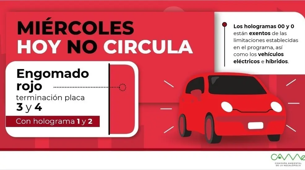 CIUDAD DE MÉXICO.- Las restricciones del programa Hoy No Circula para este miércoles señalan que todos los automóviles con engomado color rojo, con holograma 1 o 2 y con terminación de placas 3 y 4 deberán quedarse guardados en casa, recordando que esta medida aplica para las 16 alcaldías de la Ciudad de México y para 18 municipios conurbados del Estado de México.