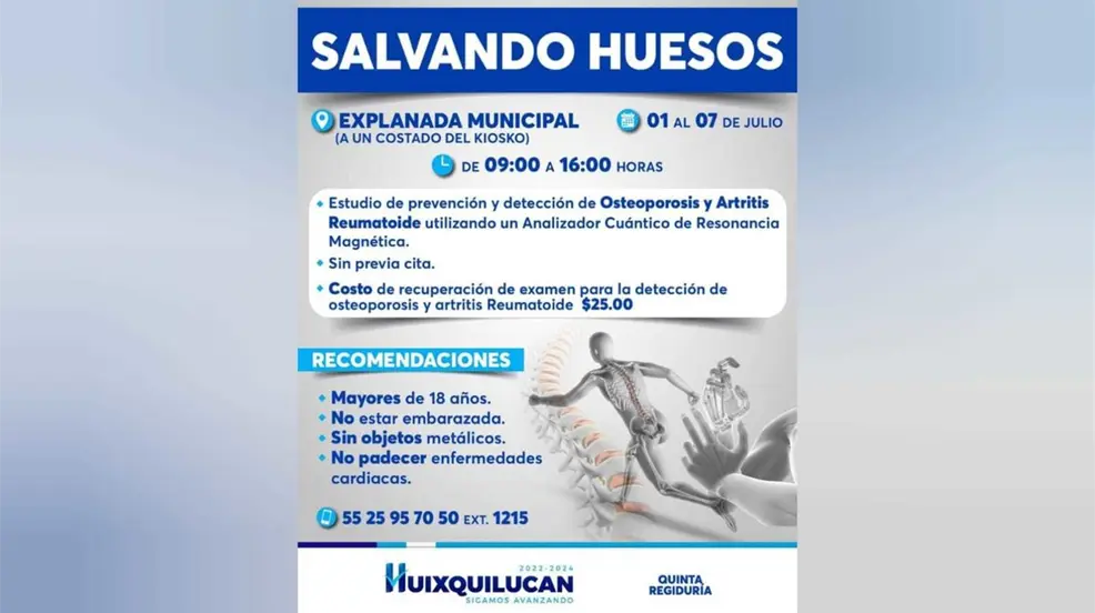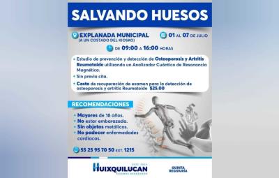 HUIXQUILUCAN, Estado de México.- El Gobierno de Huixquilucan ha anunciado su participación en la campaña nacional 'Salvando Huesos', con el objetivo de promover la prevención y detección temprana de enfermedades óseas como la osteoporosis y la artritis. A través de esta iniciativa, se ofrecen estudios de resonancia electromagnética a costos accesibles, cubriendo el 50% del costo del examen para facilitar el acceso a la población.