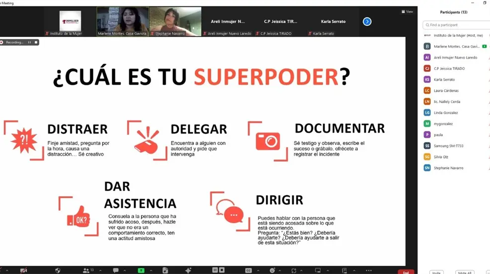 NUEVO LAREDO, Tamaulipas. El Instituto Municipal de la Mujer (INMUJER) de Nuevo Laredo llevó a cabo el curso en línea “Stand Up: Adquiere herramientas para intervenir en una situación de acoso callejero”. Esta iniciativa, realizada en colaboración con la asociación civil Casa Violeta y L’Oréal Paris, forma parte de una campaña global para crear espacios más seguros para mujeres y niñas.