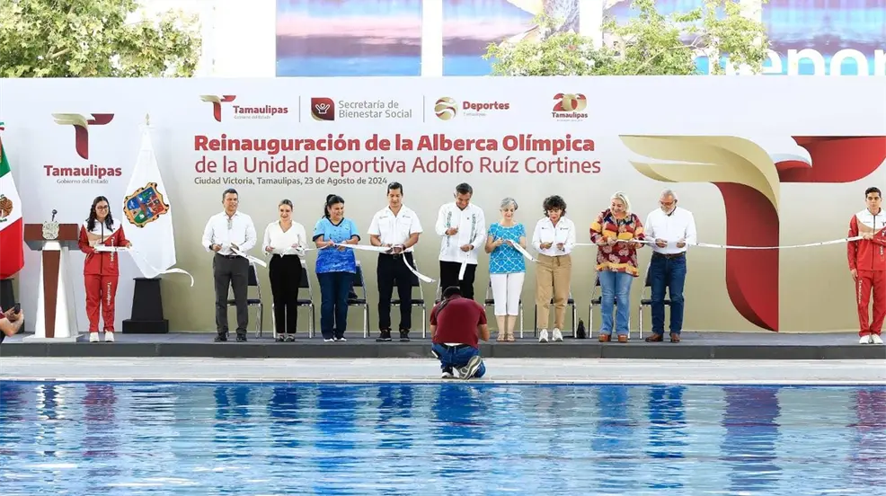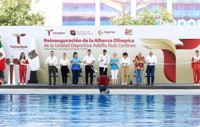 Tras cortar el listón simbólico en la reinauguración de la alberca olímpica, en la que se invirtieron 54.5 millones de pesos, y observar la presentación del equipo de nado sincronizado de la Universidad Nacional Autónoma de México, el mandatario tamaulipeco confió en que en un futuro estas instalaciones servirán para que nuestros atletas traigan campeonatos municipales, estatales y nacionales, 'porque tienen la altura y la capacidad para así hacerlo y que de esta forma podamos seguirnos incorporando con grandes participantes y campeones que tenemos en el deporte de Tamaulipas', expresó.