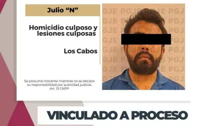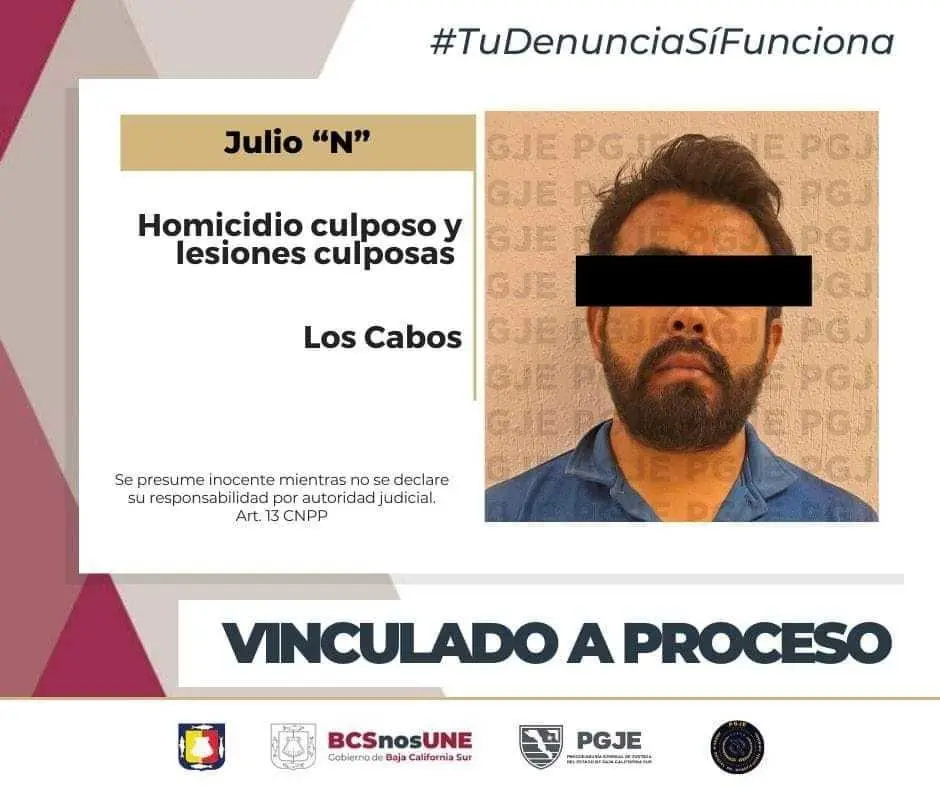 LOS CABOS, Baja California Sur.- La Procuraduría General de Justicia del Estado (PGJE), a través de la Unidad Especializada en Atención de Personas Detenidas en San José del Cabo, logró que un Juez de Control dictara Auto de Vinculación a Proceso contra Julio 'N', probable responsable de homicidio y lesiones culposas con motivo de tránsito vehicular.