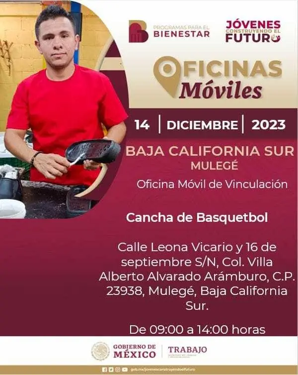 LA PAZ, Baja California Sur.- La Delegación de Programas para el Bienestar de BCS, instalará en los municipios de Los Cabos y Mulegé oficinas móviles los días 13 y 14 de diciembre para vinculación al programa “Jóvenes Construyendo el Futuro”.