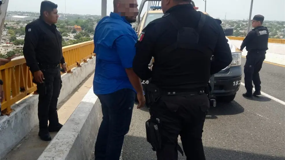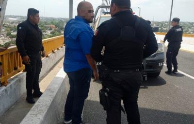 TAMPICO, Tamaulipas.- Otro intento de suicidio se registró en lo alto del Puente de Tampico al medio día de este martes, al un hombre de 31 años intentar escapar por la puerta falsa y ser intervenido por elementos de la Guardia Estatal.