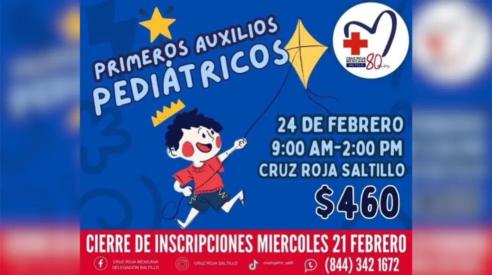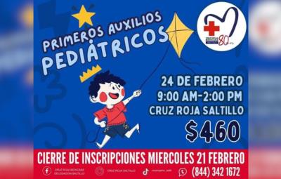 SALTILLO, Coahuila. - El próximo sábado 24 de febrero, a partir de las 9:00 de la mañana, la Cruz Roja Saltillo, llevará a cabo un curso de primeros auxilios pediátricos, el cual está dirigido al público en general.