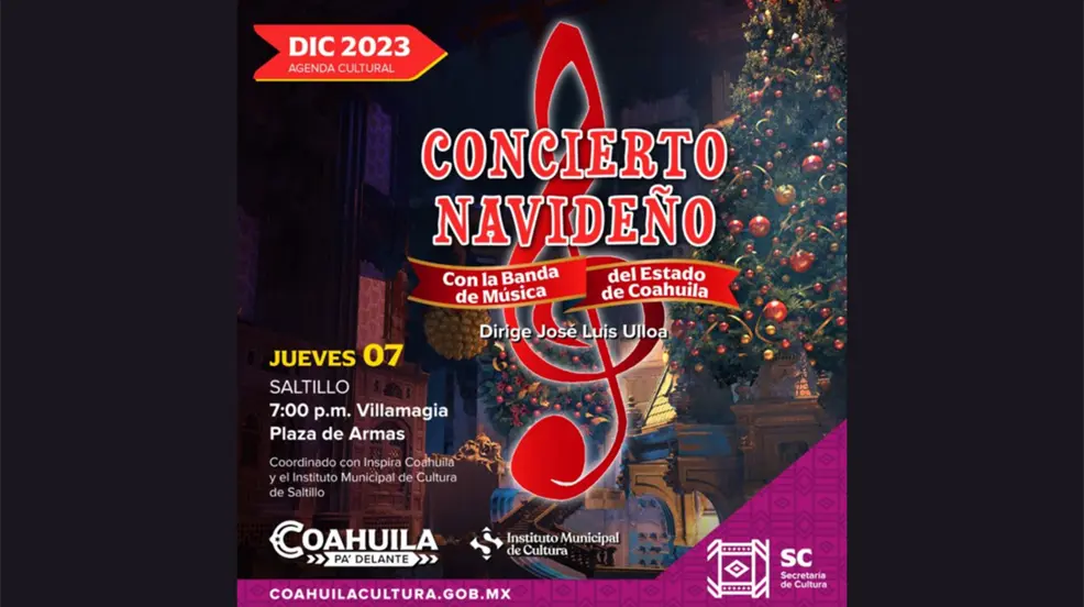 SALTILLO, COAHUILA. La Secretaría de Cultura del Estado de Coahuila hace la invitación al concierto que se realizará este jueves 06 de diciembre en Villamagia Saltillo a cargo de la banda de música del estado.