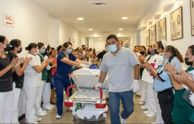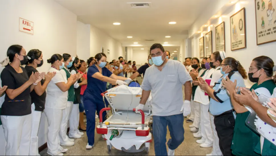 Antes de entrar a cirugía, la cual duró tres horas y media, el joven José F fue despedido con aplausos en una valla humana que trabajadores del IMSS. Foto: Twitter/ @Tu_IMSS