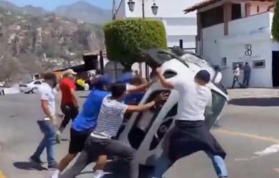 En estas protestas, los familiares golpearon a los sospechosos, a quienes lincharon, así como que se apoderaron de dos vehículos, que han sido señalados por ser pertenecientes a dichos sospechosos, los cuales volcaron, en medio de la protesta para exigir justicia por el caso.