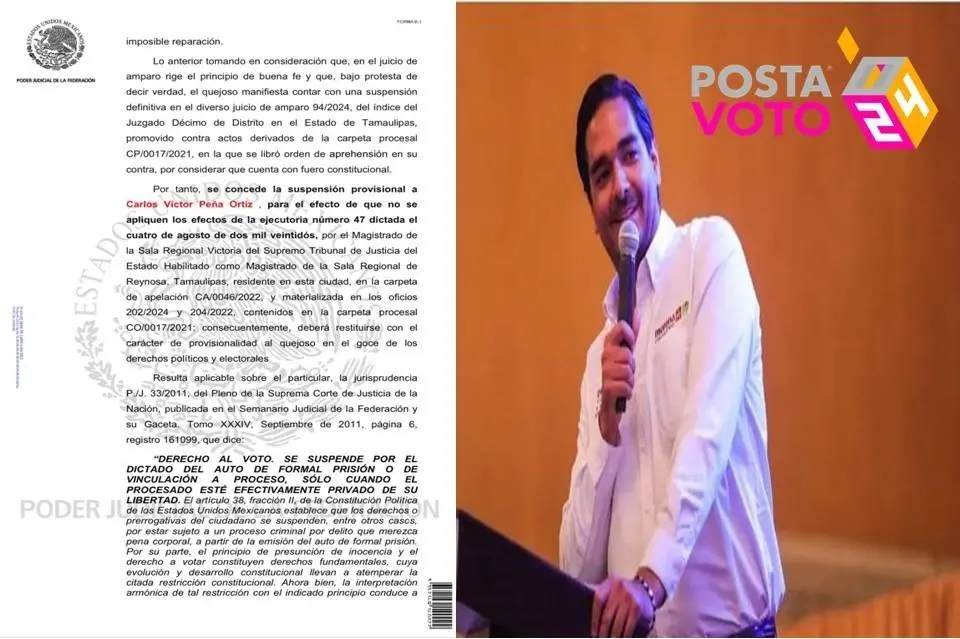 CIUDAD VICTORIA, Tamaulipas.- La Jueza Octavo de Distrito en Tamaulipas, Adriana Yolanda Vega Marroquín, ordenó al INE, restituir los derechos político-electorales a Carlos Peña Ortiz y notificarlo al Instituto Electoral de Tamaulipas (Ietam).
