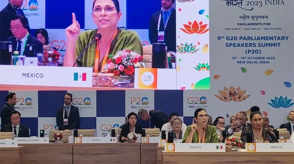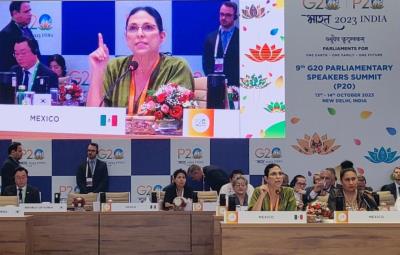 CIUDAD DE MÉXICO.- Al participar en la novena Cumbre de Presidencias Parlamentarias del G20 (P20), en Nueva Delhi, India, con el tema: “Del desarrollo de la mujer al desarrollo de las mujeres liderado por mujeres”, Marcela Guerra Castillo, presidenta de la Mesa Directiva de la Cámara de Diputados, afirmó que la inclusión del género femenino en la toma de decisiones no es una concesión, sino un derecho, por lo que la paridad debe ser entendida como una garantía constitucional y luchar por que forme parte de los principios rectores del Estado.
