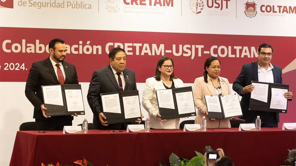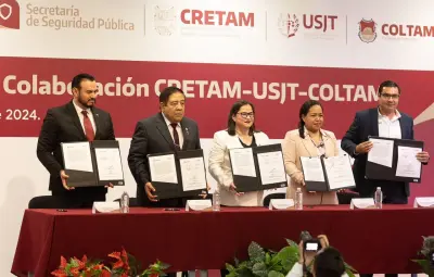 La firma de estos convenios contó con la presencia de autoridades como Lucía Aimé Castillo Pastor, Secretaria de Educación de Tamaulipas; Mtro. Sergio Hernando Chávez García, Secretario de Seguridad Pública; Amelia Castillo Morán, Rectora del CRETAM; Willy Zúñiga Castillo, Rector de la USJT; y Marco Moreno Castellanos, Rector del COLTAM. Con este tipo de iniciativas, Tamaulipas avanza en su proceso de transformación, impulsando la colaboración y el trabajo conjunto para el beneficio de la educación en la región.