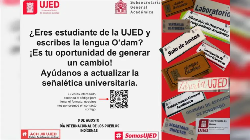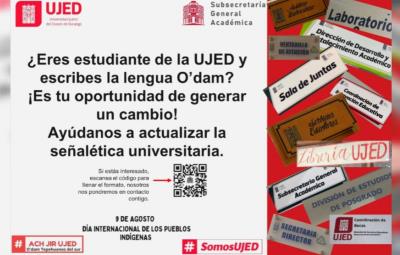 La idea es contar con letreros y avisos en lengua O'dam al interior de las instalaciones pertenecientes ala máxima casa de estudios de Durango, y para ello ha publicado una convocatoria en la que se hace el llamado al alumnado para formar parte de este proyecto.