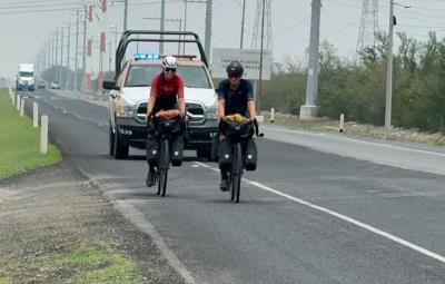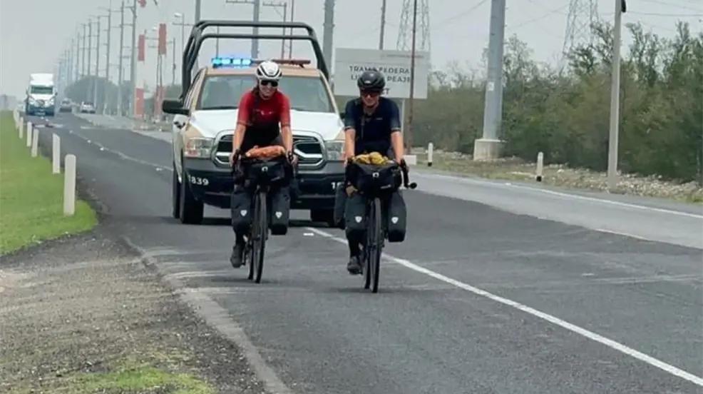VICTORIA, Tamaulipas.- Dos ciclistas alemanas, Laura y Antonia, expresaron su agradecimiento al personal de la Guardia Estatal de Tamaulipas por el apoyo brindado durante su travesía desde Ushuaia, Argentina, hasta Alaska.
